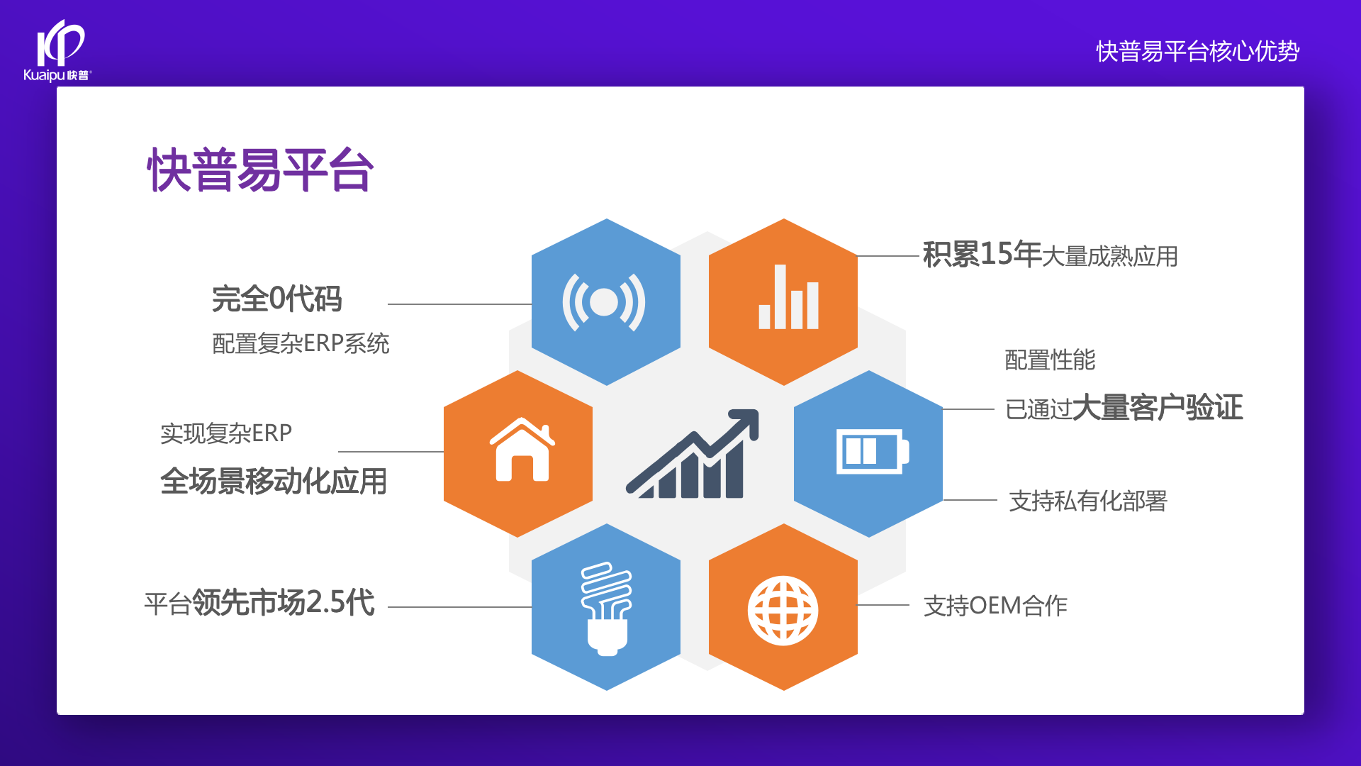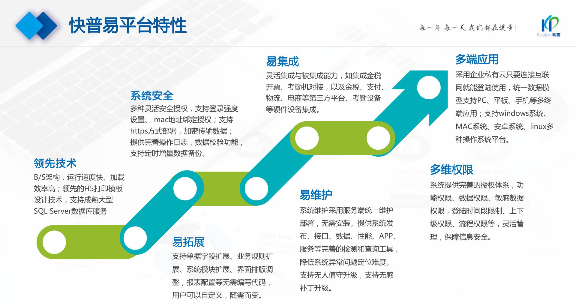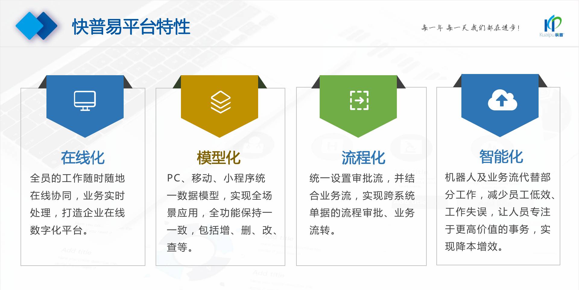 為了解決市場需求與平臺產品瓶頸等矛盾,實現(xiàn)徹底的零代碼平臺,快普堅持理念創(chuàng)新,以理念推動平臺技術的創(chuàng)新。“以不變應萬變”的理念:分析哪些東西未來肯定不變?哪些趨勢未來一定會變?從變化中找出不變的因素,從不變中找出變動的因素;從量變到質變,經歷萬變總結抽象出不變的本質?;诳炱臻L期的信息化服務經驗,開發(fā)配置出企業(yè)數(shù)字化轉型工具:快普易平臺成功解決了企業(yè)數(shù)字化轉型升級面臨的客戶大量個性化需求,真正實現(xiàn)隨需而變的設計理念,大大降低了信息化投入成本,提高信息化效率,幫助企業(yè)實現(xiàn)自主可控的技術創(chuàng)新,從而進一步推動企業(yè)的業(yè)務創(chuàng)新和管理創(chuàng)新。