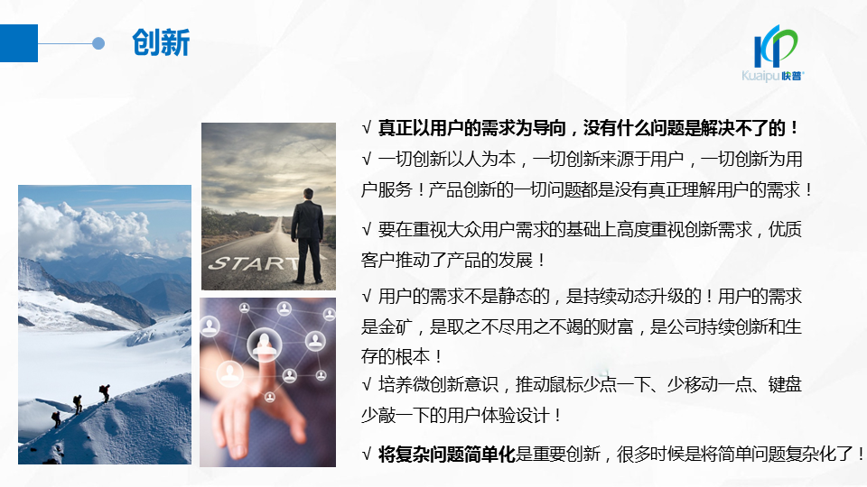 溫董在大會(huì)上指出:“成功的企業(yè)、成功的產(chǎn)品都在做符合人性的事!成功的個(gè)人都在挑戰(zhàn)人性弱點(diǎn)!作為中國(guó)企業(yè)信息化管理的服務(wù)商,我們應(yīng)該充分理解人性定律,為客戶提供一切人性化的產(chǎn)品與服務(wù),讓快普成為最懂企業(yè)用戶需求的中國(guó)企業(yè)!”