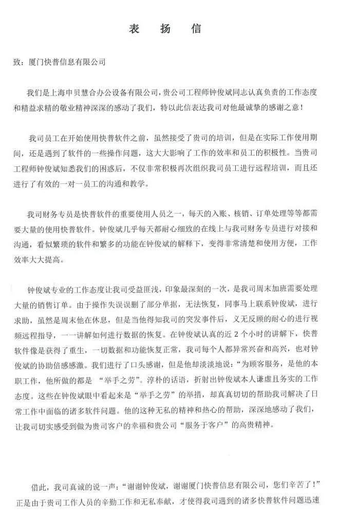 信中提到,申貝慧合財(cái)務(wù)人員是快普軟件的重要使用人員之一,每天入賬、核銷、訂單處理等等都需要大量的使用快普軟件。鐘俊斌工程師耐心細(xì)致的與其財(cái)務(wù)人員在線上對接溝通,幫助其快速順暢使用軟件,提高工作效率。