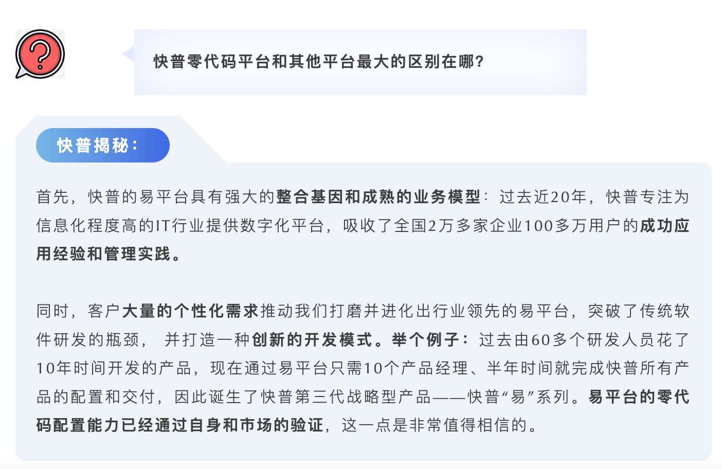 是的,我們可以很自信地說(shuō)“快普零代碼平臺(tái)讓數(shù)字化轉(zhuǎn)型變得簡(jiǎn)單、可行”。這個(gè)是面對(duì)數(shù)字化轉(zhuǎn)型的所有角色而言的,包括我們自身軟件研發(fā)、實(shí)施交付,以及合作伙伴、用戶等,易平臺(tái)在效率、成本、技術(shù)門(mén)檻和可擴(kuò)展性等方面來(lái)說(shuō)都有著顛覆性的突破,是非常有意義和必要的基礎(chǔ)設(shè)施。總結(jié)說(shuō)有下面幾點(diǎn):
