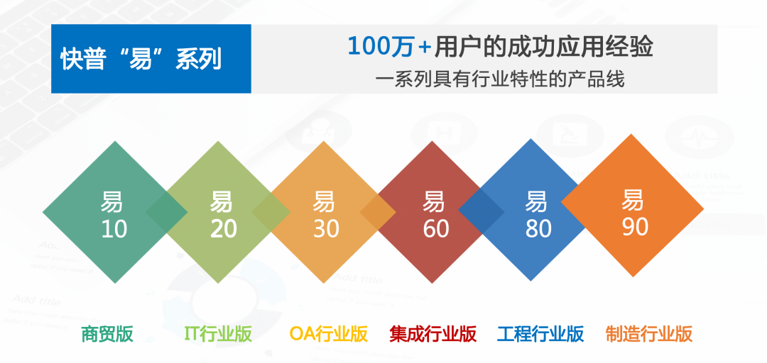 除易10之外,快普“易”系列同時(shí)推出了多個(gè)行業(yè)版本(如下圖),用“標(biāo)準(zhǔn)化+行業(yè)化+個(gè)性化”等特性解決企業(yè)大量個(gè)性化需求,從而幫助客戶(hù)高效率、低成本地實(shí)現(xiàn)數(shù)字化轉(zhuǎn)型升級(jí)。