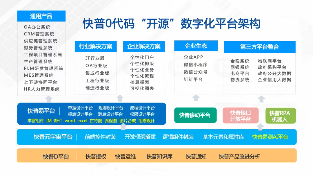 為此,快普依托自主研發(fā)的“快普易”整合管理平臺,以先進的技術架構為企業(yè)提供簡單、靈活的應用體驗。平臺具備零代碼配置、多系統(tǒng)無縫整合、AI深度嵌入等核心優(yōu)勢,為企業(yè)提供一條“小快輕準”的數(shù)字化轉型路徑:
