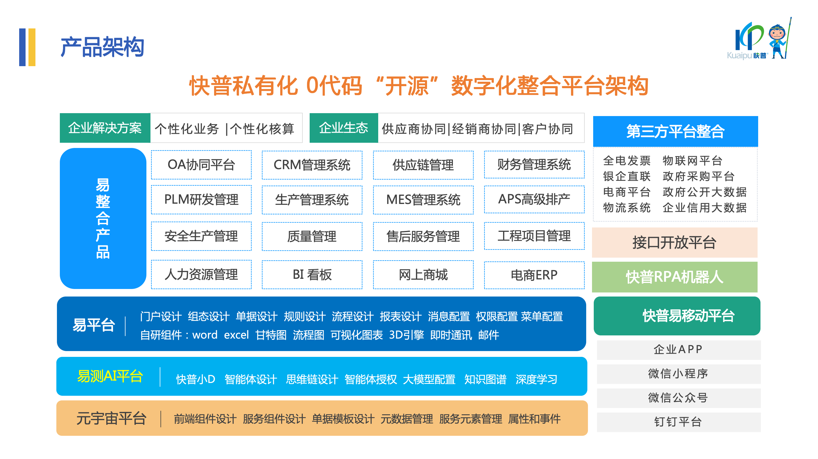 針對企業(yè)普遍面臨的“信息孤島”難題——系統(tǒng)林立、數(shù)據(jù)不通、業(yè)務流程斷點卡點眾多,導致內(nèi)部協(xié)同低效、管理成本高昂等問題,溫董指出:“系統(tǒng)整合是提質(zhì)增效最有效的手段,碎片化的系統(tǒng)建設模式已成為制約企業(yè)全局效率的罪魁禍首?!?br> 快普以“整合管理”為核心的數(shù)字化轉(zhuǎn)型理念,通過“一個平臺”覆蓋企業(yè)全鏈條管理,包括PLM研發(fā)管理、APS高級排產(chǎn)、MES車間執(zhí)行、供應鏈協(xié)同、集團化財務核算等。